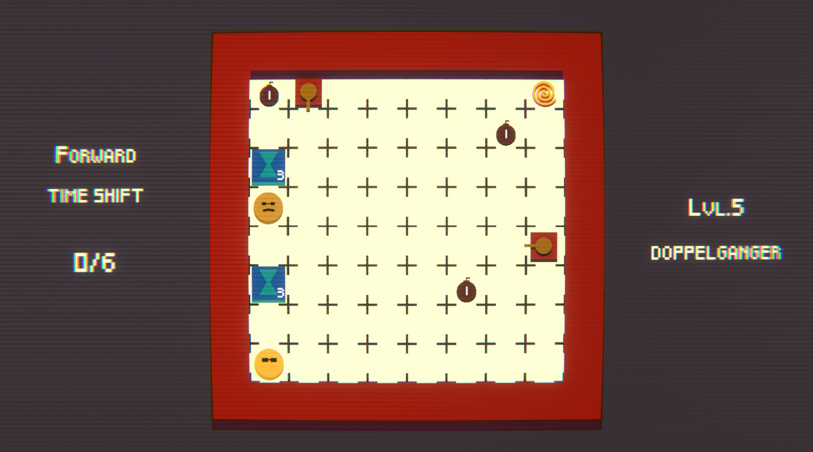 Doppelganger - Tries to reach the time spiral. If it reaches you lose. It has its own timeline so it is uneffected from your actions. Can die from bombs and bullets.